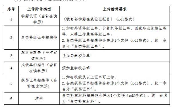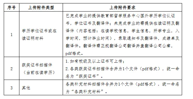 3.上传应聘附件材料。应聘毕业生通过招聘平台及时、规范上传个人应聘附件材料,上传附件数量一般不超过7个。应聘毕业生应确保应聘材料能正常打开、清晰显示,因应聘材料不能正常打开、图像不清晰或未按规范要求填报将影响简历筛选结果。上传附件清单如下: