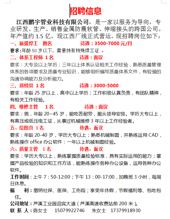 【招聘】江西鹏宇管业科技有限公司招聘简