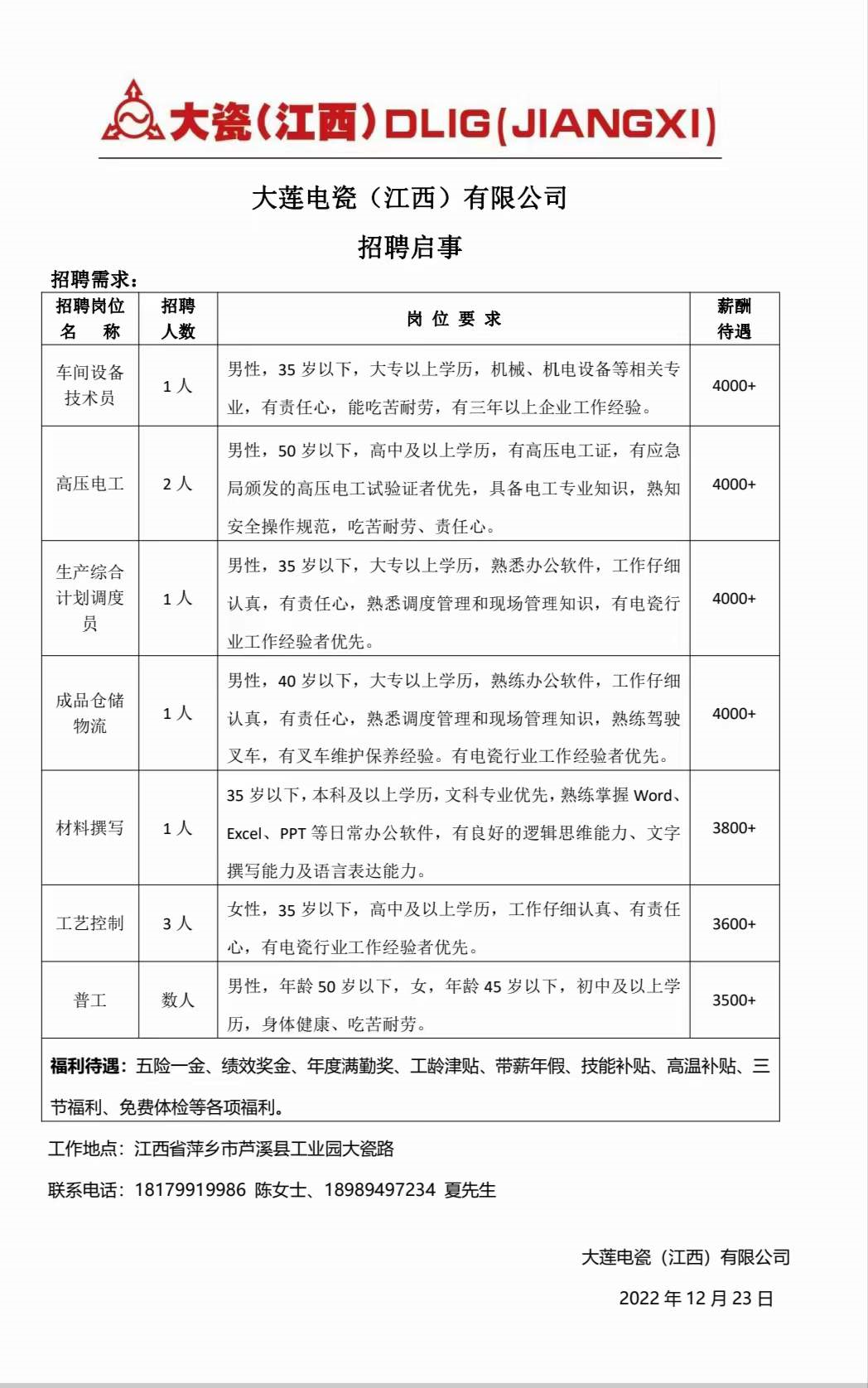 【招聘】大莲电瓷江西有限公司招聘简章