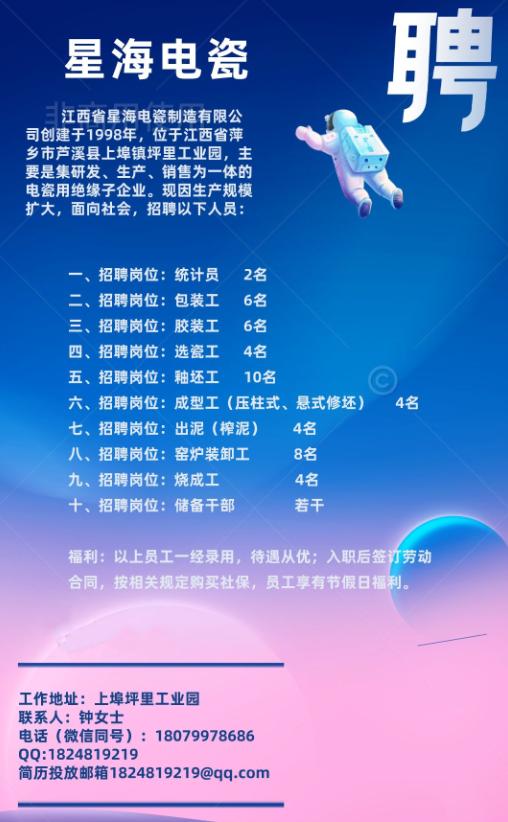 【招聘】江西省星海电瓷制造有限公司招工启事