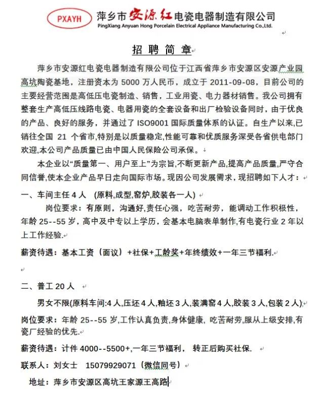 【招聘】萍乡市安源红电瓷电器制造有限公司