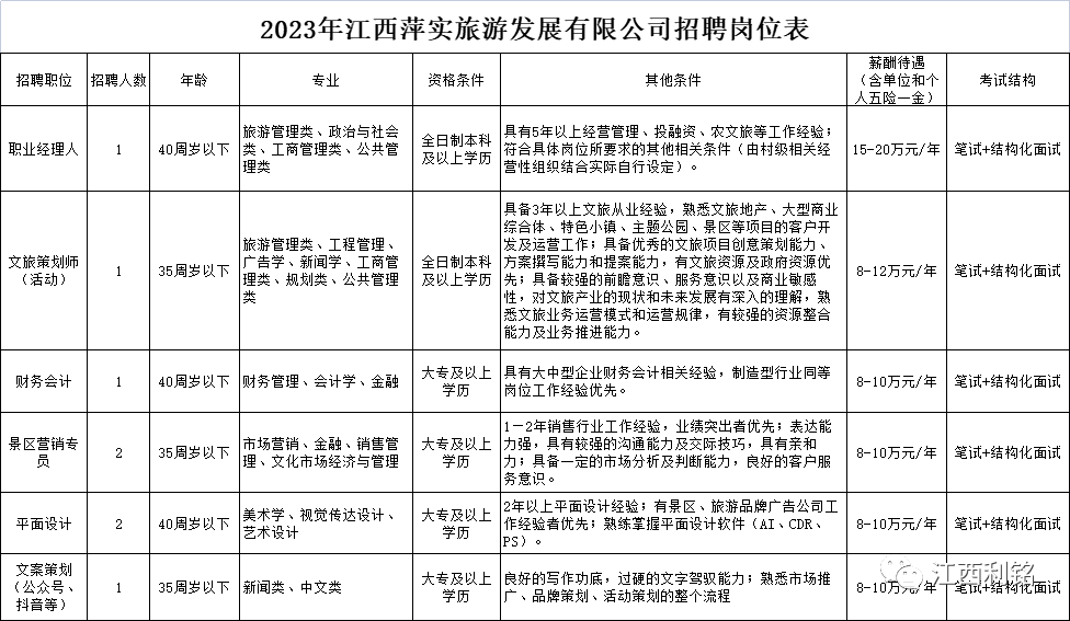 附件1.2023年江西萍实旅游发展有限公司招聘岗位表