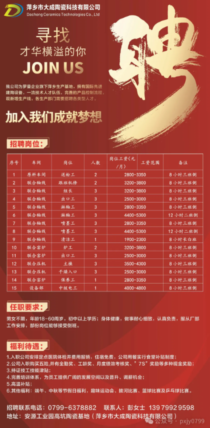 【招聘】萍乡市大成陶瓷科技有限公司招聘简章