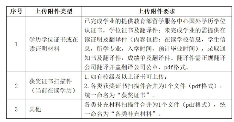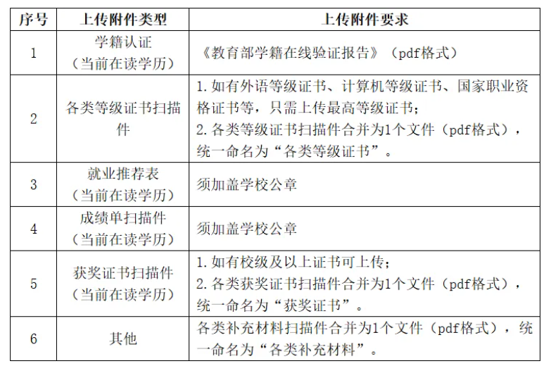 3.上传应聘附件材料。应聘毕业生通过招聘平台及时、规范上传个人应聘附件材料,上传附件数量一般不超过7个。应聘毕业生应确保应聘材料能正常打开、清晰显示,因应聘材料不能正常打开、图像不清晰或未按规范要求填报将影响简历筛选结果。上传附件清单如下: